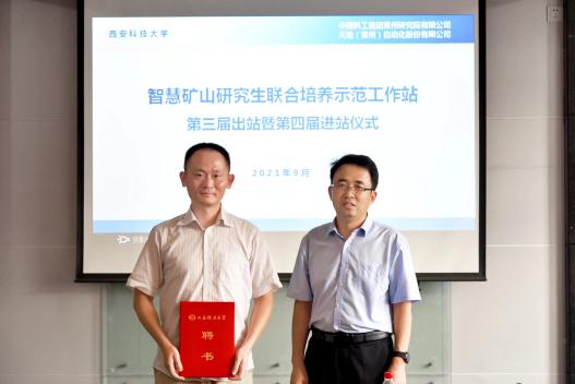 2021年9月17日,在中煤科工集团常州研究院召开了“智慧矿山研究生联合培养示范工作站”进出站仪式,第三届联合培养12位研究生正式结业出站,第四届联合培养8位研究生同时进站。常州院党委副书记、总经理王海波,雷竞技raybet官方平台院长刘树林,研究生院副院长李成峰,雷竞技raybet官方平台副院长潘红光、研究生培养及学科办公室主任赵心恬以及校内外导师代表、进出站研究生参加了仪式。仪式由段瑞威主任主持。